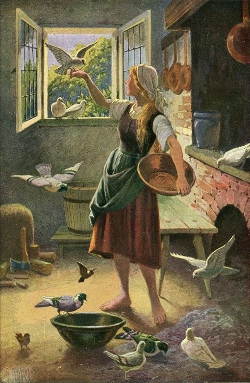 Thank you for sharing this version of Cinderella. I'm fascinated by the birds--they almost remind me of faeries, especially the white bird in the tree and the two white pigeons who blind the stepsisters at the end. White often denotes otherworldly animals, and in faerie folklore, faeries sometimes blind humans for seeing past their glamour or for meddling in their ways.