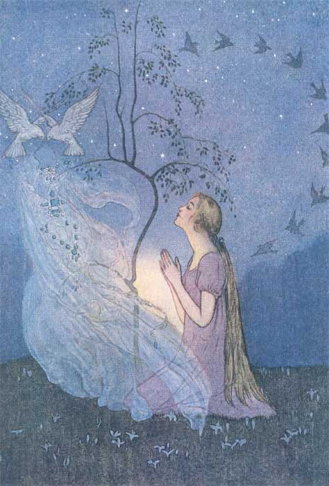 Cinderella thanked him, went to her mother’s grave, and planted the branch on it, and she wept so much that her tears fell upon it and watered it. It grew and became a beautiful tree.